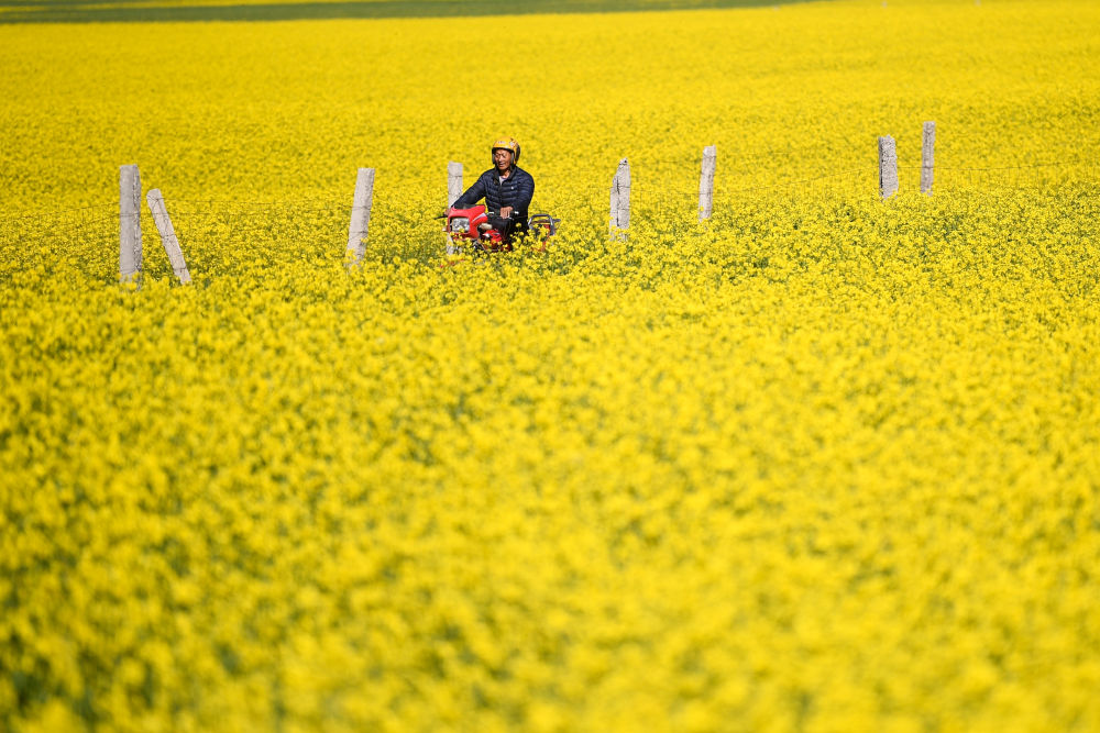 ↑ 7月3日,在青海省海北藏族自治州門源回族自治縣,蜂農(nóng)騎著摩托穿過油菜花田。新華社記者 張龍 攝