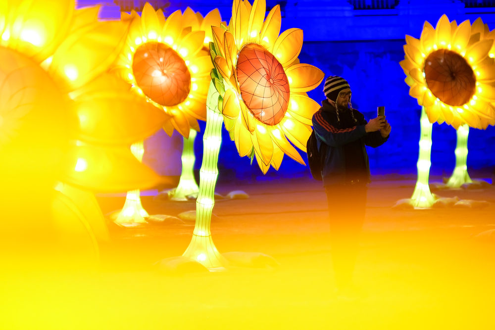↑ 2月10日,一名男子在比利時(shí)布魯塞爾欣賞一處燈光藝術(shù)作品。新華社記者 張鋮 攝