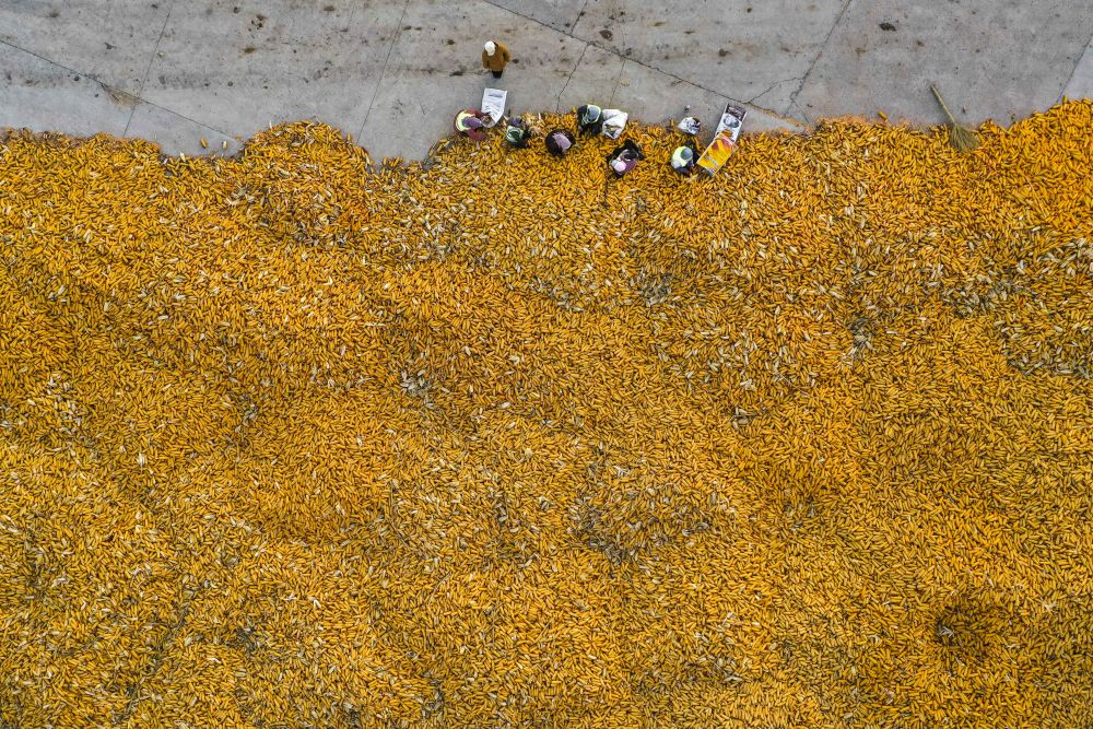 ↑ 11月1日,農(nóng)民在吉林省公主嶺市環(huán)嶺街道土城子村志和農(nóng)機(jī)服務(wù)專業(yè)合作社內(nèi)分揀收獲的玉米,準(zhǔn)備進(jìn)行下一步的儲存工作(無人機(jī)照片)。新華社記者 許暢 攝