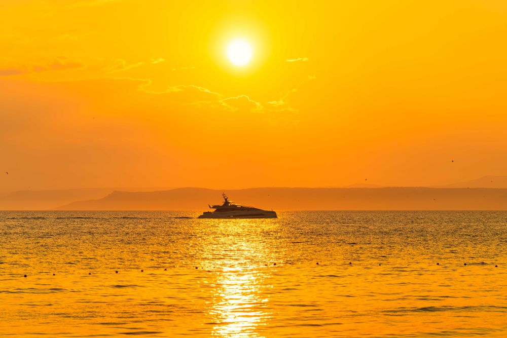 ↑ 這是7月6日在俄羅斯符拉迪沃斯托克拍攝的落日余暉中的游艇。新華社發(fā)(郭飛洲攝)