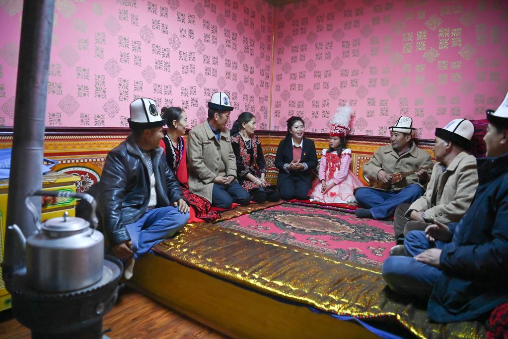 12月16日,新疆克孜勒蘇柯爾克孜自治州阿克陶縣布倫口鄉(xiāng)布倫口村,李文娟(中)在村民家中走訪。新華社記者李響攝