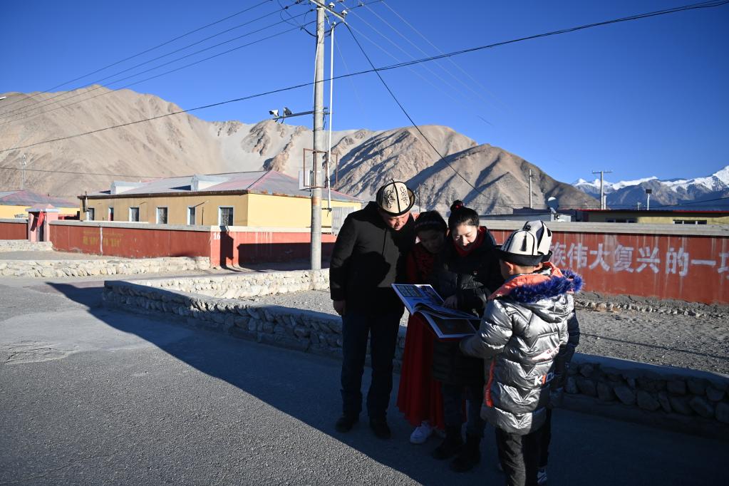 12月17日,新疆克孜勒蘇柯爾克孜自治州阿克陶縣布倫口鄉(xiāng)布倫口村,李文娟(中)在向當(dāng)?shù)卮迕裥v黨的二十大精神。新華社記者李響攝