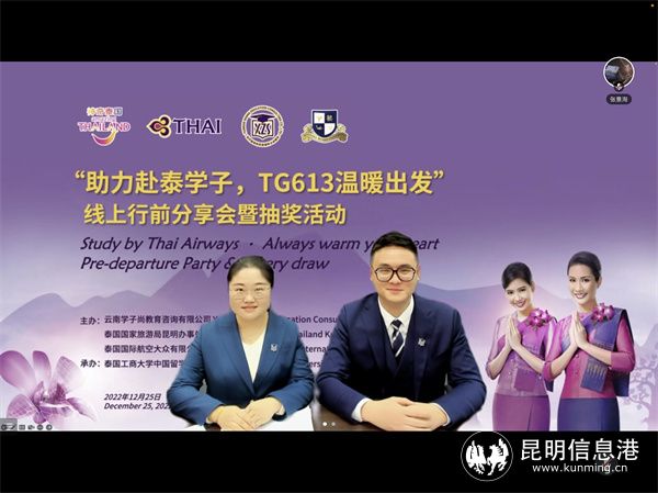 12月25日晚,由泰國(guó)國(guó)家旅游局昆明辦事處、泰國(guó)國(guó)際航空大眾有限公司昆明辦事處及云南學(xué)子尚教育咨詢有限公司聯(lián)合主辦、泰國(guó)工商大學(xué)中國(guó)留學(xué)生服務(wù)中心共同協(xié)辦的“助力赴泰學(xué)子,TG613溫暖出發(fā)“線上行前分享會(huì)暨抽獎(jiǎng)活動(dòng)圓滿結(jié)束。