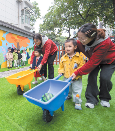 浙江省杭州市西湖區(qū)北山街道松木場社區(qū)通過加裝電梯、整治小區(qū)外立面、增設(shè)公共綠地、建設(shè)鄰里中心與托育中心等措施實施老舊小區(qū)改造。圖為在新建成的社區(qū)托育中心,老師帶著小朋友們玩游戲。新華社記者 江漢攝