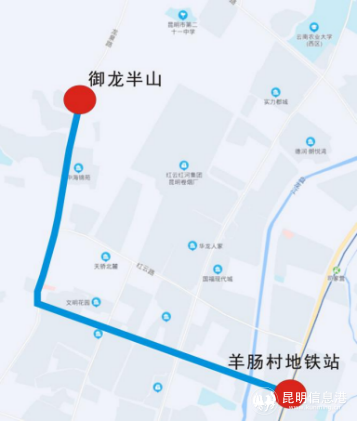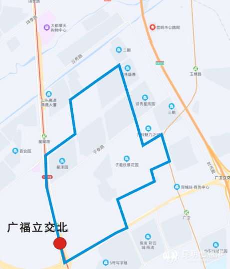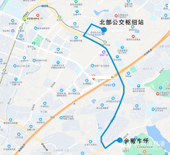 途經(jīng)云大西路、紅外路、昆洛路、彩云北路、永中路、眾天路、雨龍路、日新路、民航路、國(guó)貿(mào)路、春城路、永平路,可接駁地鐵1號(hào)線(xiàn)曉東村站、地鐵4號(hào)線(xiàn)羊甫頭站。