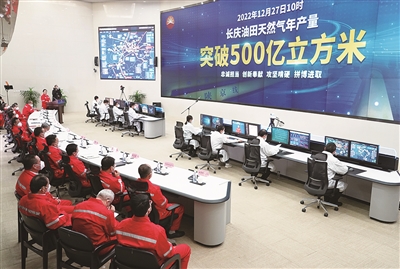 12月27日,在中國(guó)石油長(zhǎng)慶油田生產(chǎn)指揮中心電子顯示屏上,天然氣生產(chǎn)曲線躍上500億立方米大關(guān),達(dá)到500.6億立方米,標(biāo)志著我國(guó)建成首個(gè)年產(chǎn)500億立方米特大型產(chǎn)氣區(qū)。圖為在位于陜西西安的中國(guó)石油長(zhǎng)慶油田生產(chǎn)指揮中心內(nèi),電子屏上顯示天然氣年產(chǎn)量突破500億立方米。