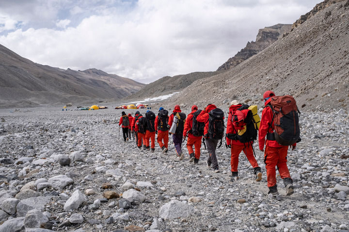 珠峰科考登頂工作小組隊(duì)員們安全返回珠峰大本營(yíng)(5月4日攝)。新華社記者 孫非 攝
