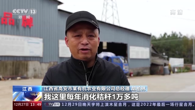 江西省高安市某有機農(nóng)業(yè)有限公司總經(jīng)理 胡柏林:我這里每年消化秸稈1萬多噸,用來做有機肥發(fā)酵。肥料現(xiàn)在出貨量每天是十來車,將近達(dá)到200多噸(每天)。