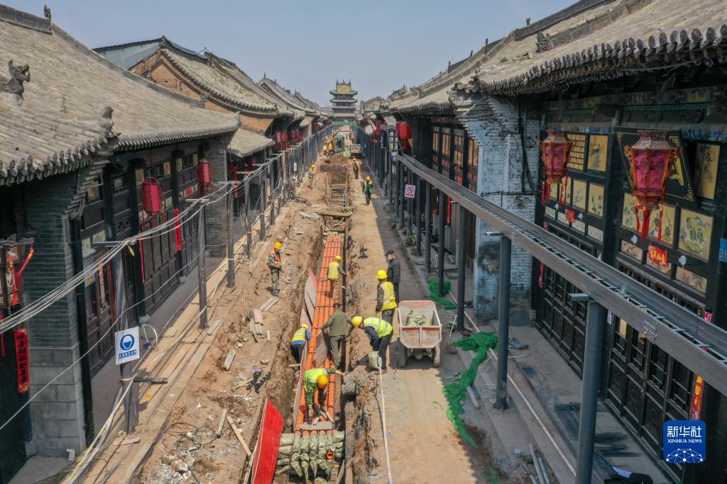 這是平遙古城內(nèi)基礎(chǔ)設(shè)施提升改造工程施工現(xiàn)場(2022年4月16日攝)。新華社發(fā)(梁生仁攝)