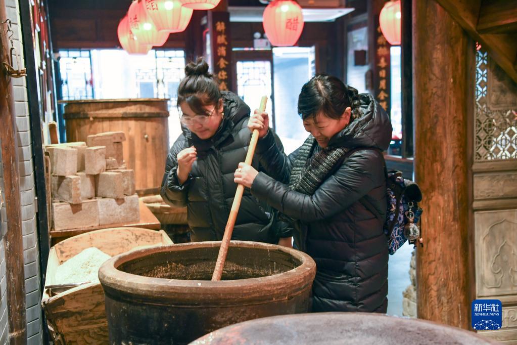 游客在平遙古城東湖老醋坊內(nèi)體驗陳醋發(fā)酵打耙(2022年1月28日攝)。新華社發(fā)(梁生仁攝)