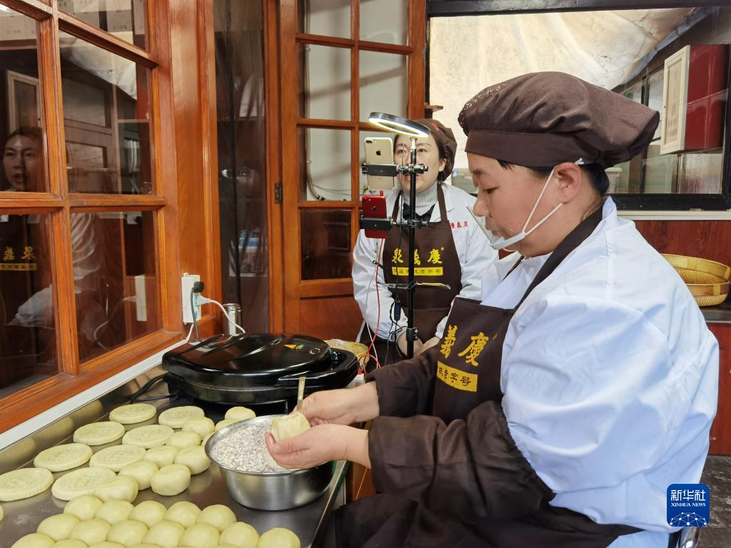 在平遙古城慶義泉爐食鋪內(nèi),工人們忙著打月餅、直播賣貨(2022年1月25日攝)。新華社記者王學(xué)濤攝