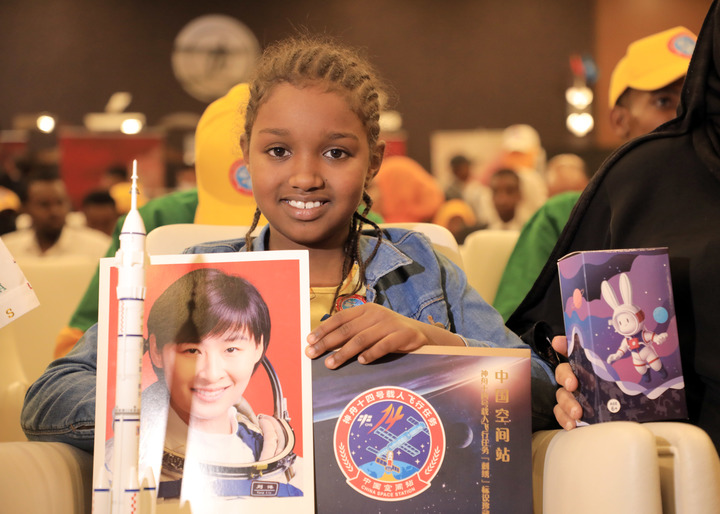 2022年9月6日,在索馬里首都摩加迪沙的“天宮對(duì)話”活動(dòng)索馬里分會(huì)場(chǎng),當(dāng)?shù)貙W(xué)生展示活動(dòng)紀(jì)念品 新華社發(fā)(扎卡里亞攝)