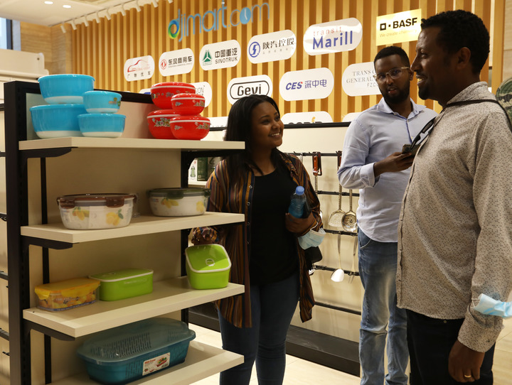 2022年9月14日,在吉布提國(guó)際自貿(mào)區(qū),非洲創(chuàng)業(yè)青年在跨境電商平臺(tái)商品展示區(qū)交流。新華社記者 董江輝 攝