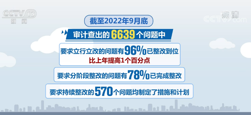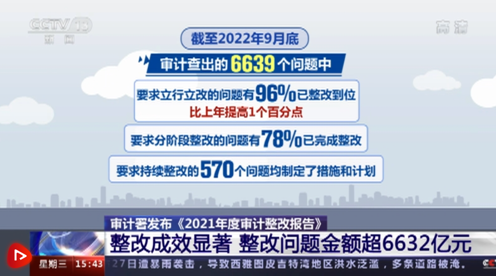 《審計(jì)整改報(bào)告》指出,今年整改成效更加顯著,重大問題整改取得實(shí)質(zhì)性突破。截至2022年9月底,審計(jì)查出的6639個(gè)問題中,要求立行立改的問題有96%已整改到位,比上年提高1個(gè)百分點(diǎn);要求分階段整改的問題有78%已完成整改;要求持續(xù)整改的570個(gè)問題均制定了措施和計(jì)劃。有關(guān)地方、部門和單位已整改問題金額6632.74億元,制定完善相關(guān)規(guī)章制度2800多項(xiàng),追責(zé)問責(zé)1.4萬人,糾治了一些阻礙改革發(fā)展和長(zhǎng)期未解決的頑瘴痼疾。