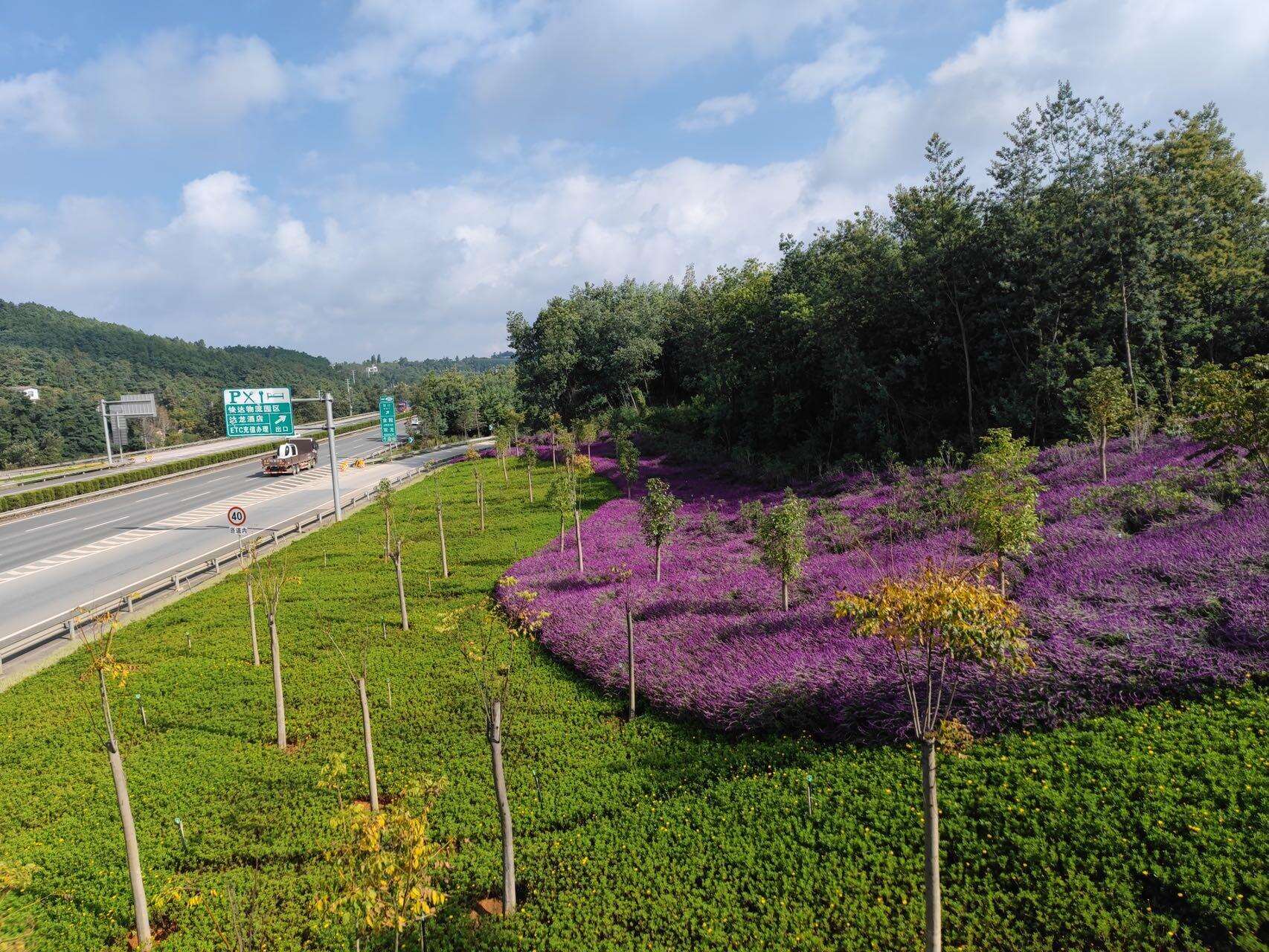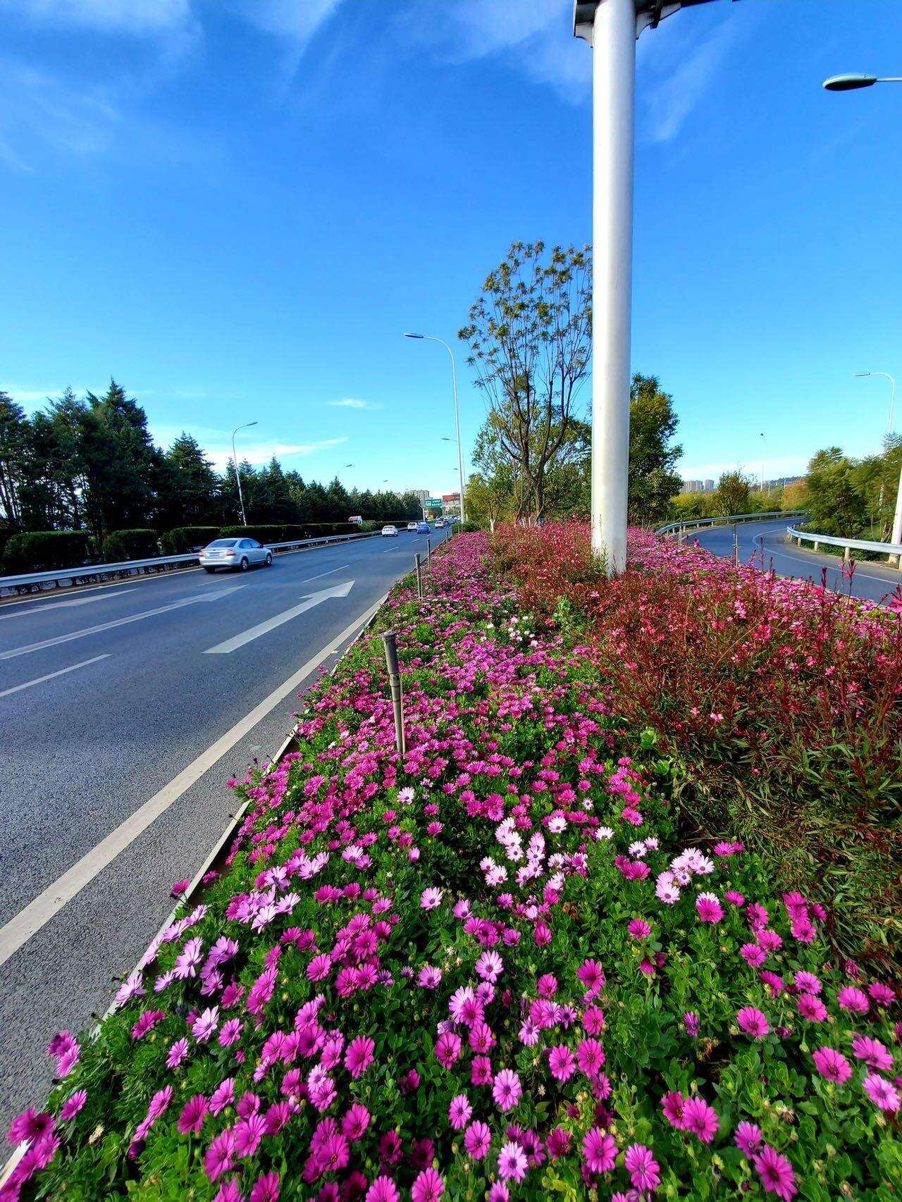 劉靜感受到的變化得益于昆明市綠美公路的建設(shè)。今年來,昆玉高速公路的管養(yǎng)單位按照昆明市交通運(yùn)輸局綠美公路的建設(shè)要求,積極探索、試點(diǎn)先行,針對(duì)不同的適用場(chǎng)景采取不同的樹種搭配、種植方式等進(jìn)行大膽先試,例如,路中間隔離帶色彩單調(diào)就增加瑪格麗特、夾竹桃等色葉植物進(jìn)行搭配;路兩側(cè)柏樹下苗木長(zhǎng)勢(shì)不佳就栽植成活率強(qiáng)的迎春柳進(jìn)行覆蓋等。經(jīng)過一段時(shí)間的建設(shè),目前昆玉高速公路沿線煥然一新,道路兩側(cè)綠樹、地被、花卉連點(diǎn)成線,各色花卉隨季節(jié)更迭盛開,色彩斑斕,錯(cuò)落有致,與來往車流相互映襯,景色怡人。