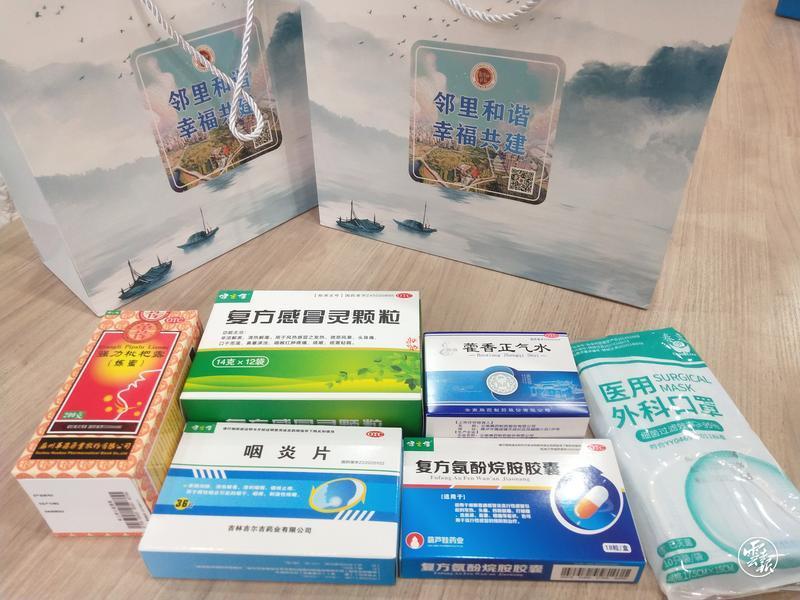 禮包中包含藿香正氣水、復(fù)方感冒靈顆粒、咽炎片等不同功效的藥品以及口罩,禮包袋上寫著“鄰里和諧 幸福共建”8個(gè)字。收到藥品禮包的李女士高興地說:“家里正好沒有備藥,社區(qū)送來的這些緊缺藥品非常及時(shí),解了我們的燃眉之急,感謝社區(qū)的關(guān)心?!?/p>