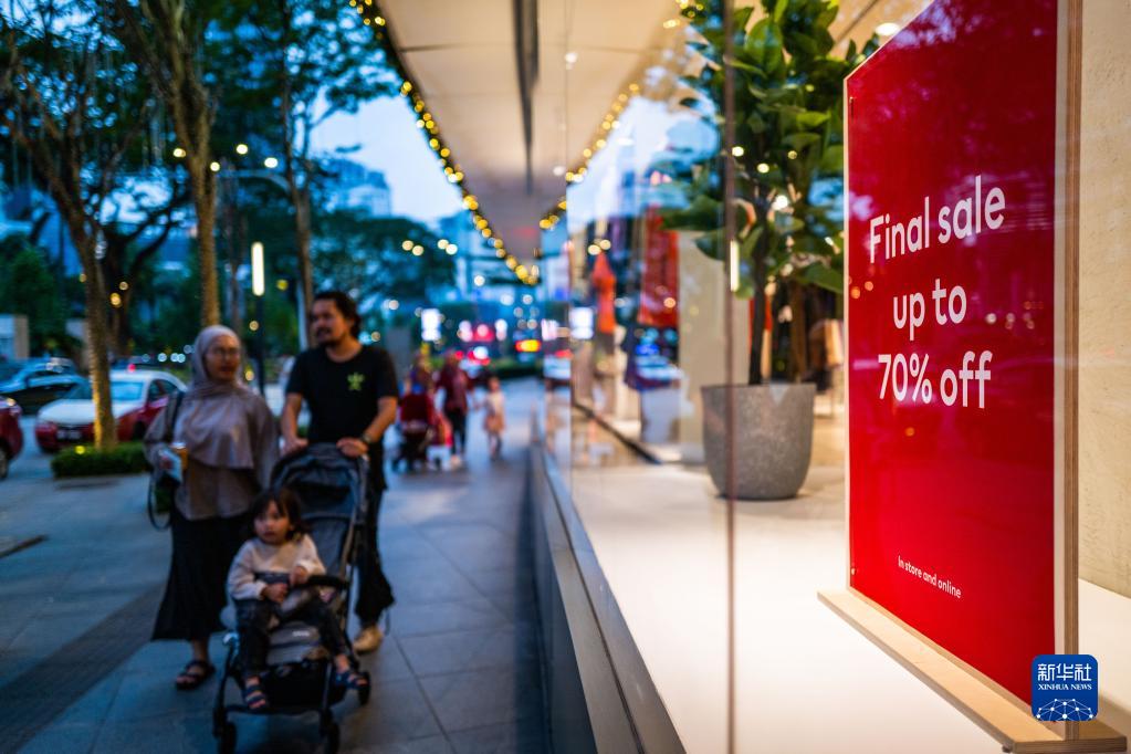 12月26日,人們從馬來西亞吉隆坡一家商店的打折信息旁走過。新華社記者 朱煒 攝