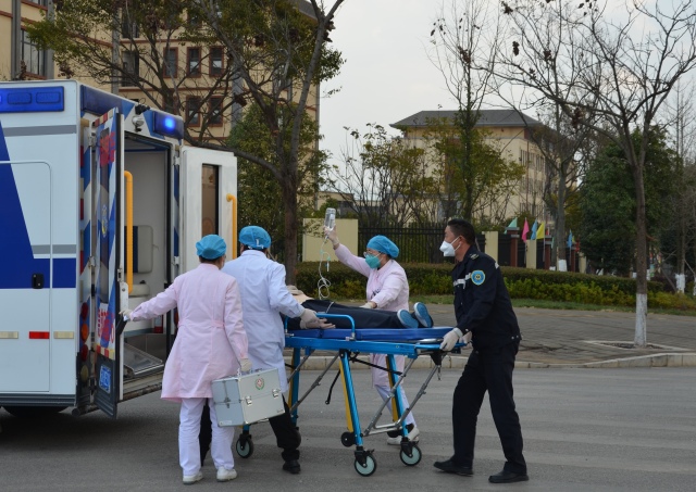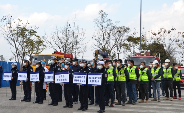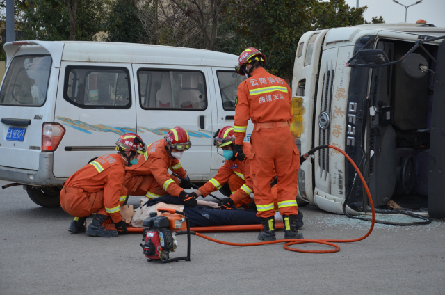 演練模擬了冬季雨霧天氣增多,在陸良縣第一中學(xué)南側(cè)道路路段內(nèi)發(fā)生一起交通事故,一輛危險(xiǎn)化學(xué)品車輛與一輛微型車相撞,造成危險(xiǎn)化學(xué)品車輛側(cè)翻,車內(nèi)一人受傷被困。