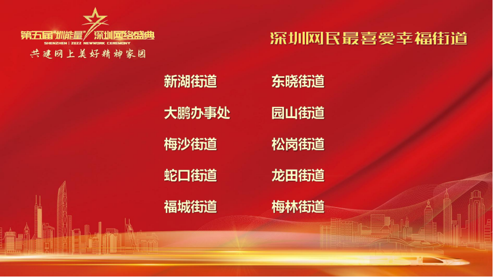 第五屆深圳網(wǎng)絡盛典,評出了“2022年深圳網(wǎng)民最喜愛幸福街道”和深圳區(qū)級融媒體優(yōu)秀傳播平臺。