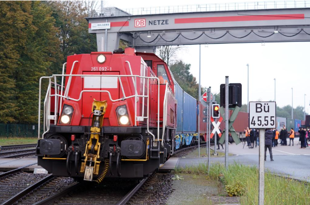 2021年10月26日,首列“上海號(hào)”中歐班列駛?cè)氲聡?guó)漢堡的貨場(chǎng)。(新華社記者王勍攝)