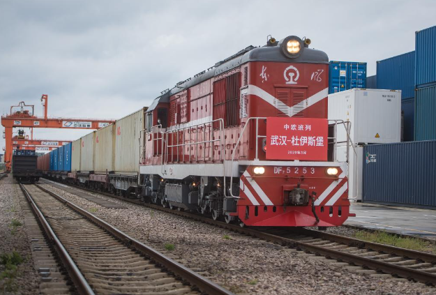 開(kāi)往德國(guó)杜伊斯堡的中歐(武漢)班列從中鐵聯(lián)集武漢中心站駛出。(新華社記者肖藝九攝)