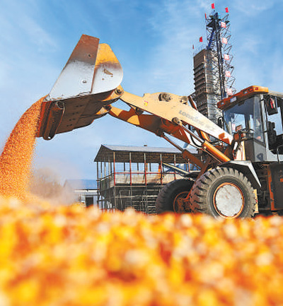 黑龍江北大荒農(nóng)墾集團趙光農(nóng)場,鏟車在曬場傾倒玉米。新華社記者 王建威攝