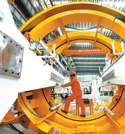 浙江中鐵裝備盾構(gòu)機生產(chǎn)基地,工人在安裝新型盾構(gòu)機的部件。龍巍攝(新華社發(fā))