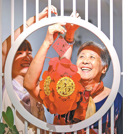 福建福州鼓樓區(qū)安泰街道,老人和社區(qū)工作者一起懸掛花燈。謝貴明攝(影像中國)
