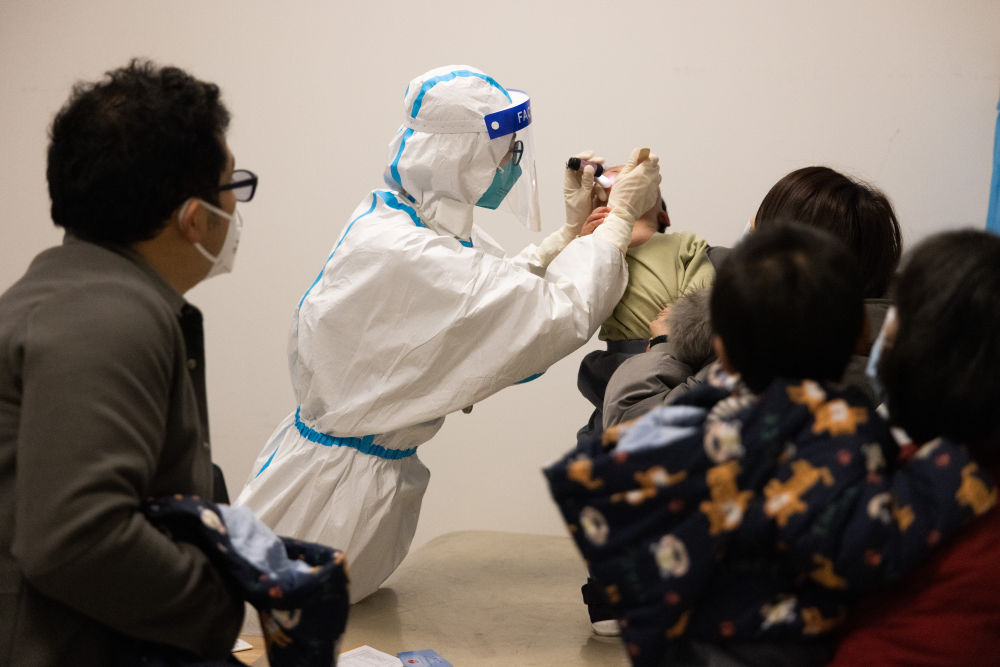 12月27日,在上海交通大學(xué)醫(yī)學(xué)院附屬新華醫(yī)院兒科發(fā)熱門(mén)診,醫(yī)生陳旭婷在檢查患兒狀況。新華社記者 金立旺 攝