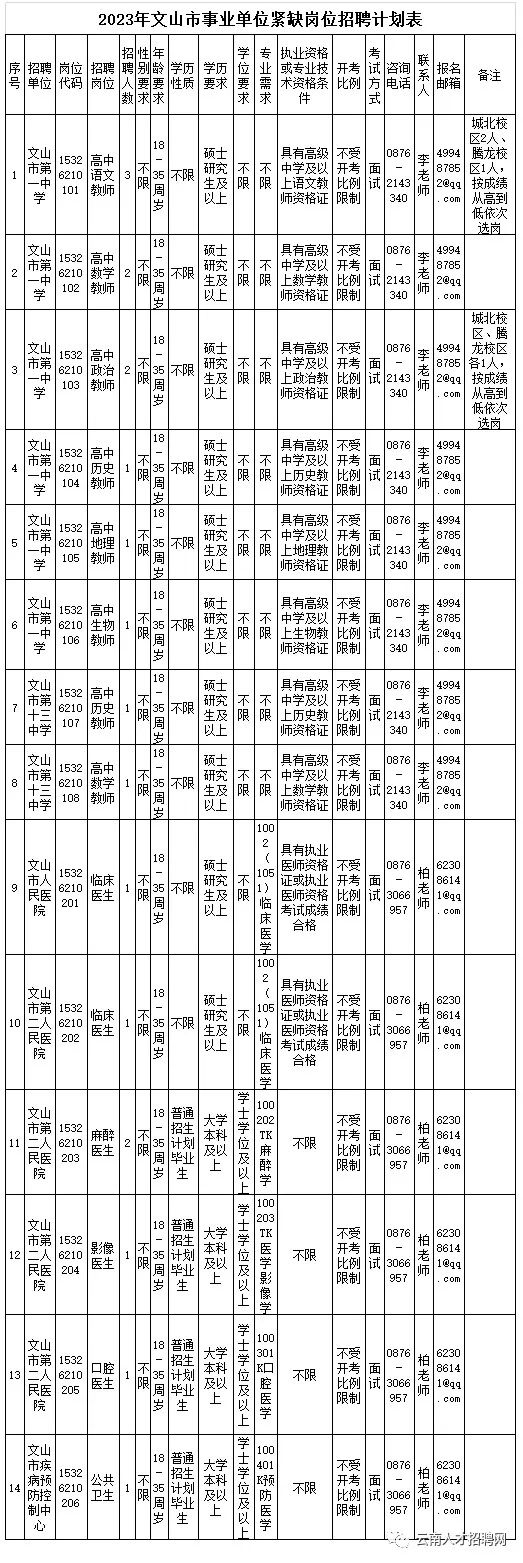 2023年文山市事業(yè)單位緊缺崗位招聘計(jì)劃共20名。具體崗位、人數(shù)、資格條件等詳見《2023年文山市事業(yè)單位緊缺崗位招聘計(jì)劃表》(下表)