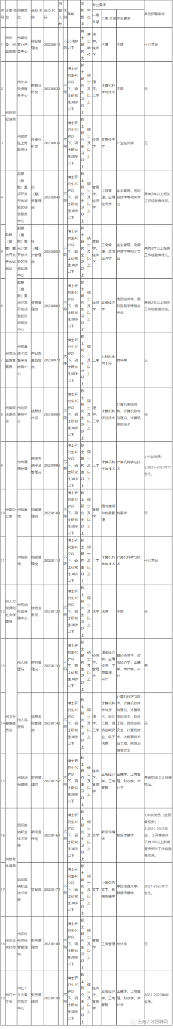 2023年西雙版納州面向高校和社會引進(jìn)一批優(yōu)秀人才,作為黨政儲備人才重點(diǎn)培養(yǎng),具體崗位要求詳見《2023年西雙版納州黨政儲備人才專項(xiàng)招引崗位表》(下表)。