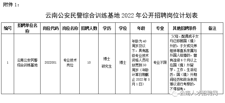 云南公安民警綜合訓(xùn)練基地(云南警官學(xué)院管理的事業(yè)單位)2022年面向社會公開招聘事業(yè)單位工作人員10名。招聘崗位條件見《云南公安民警綜合訓(xùn)練基地2022年公開招聘崗位計(jì)劃表》(下表)