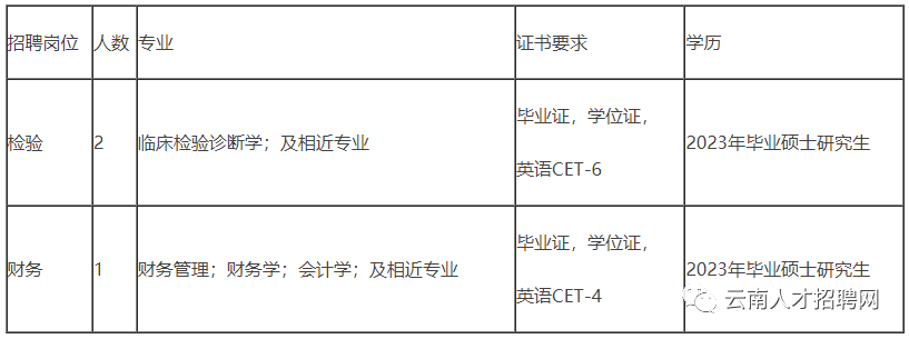 玉溪市中心血站面向普通高校2023年畢業(yè)碩士研究生,提前招聘2名檢驗(yàn)人員,1名財(cái)務(wù)人員。具體招聘信息見下表: