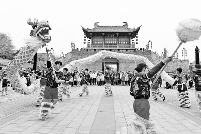 江西省贛州市章貢區(qū)郁孤臺(tái)歷史文化街區(qū)軍門樓廣場(chǎng),舞龍、舞獅、客家采茶戲等非遺民俗展演為元旦假期增添喜慶氛圍。