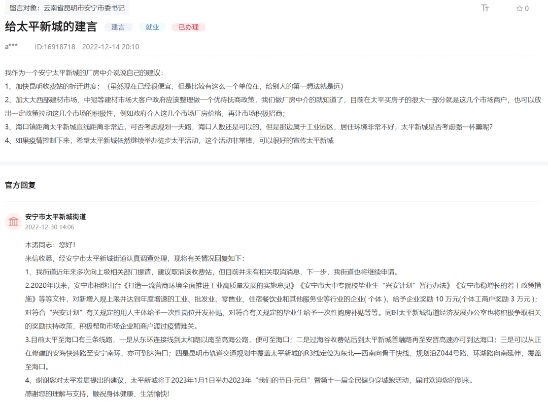 近日,有網(wǎng)友給太平新城的建言,提到“加快昆明收費站的拆遷進度”“??阪?zhèn)距離太平新城直線距離非常近,可否考慮規(guī)劃一條路”等。
