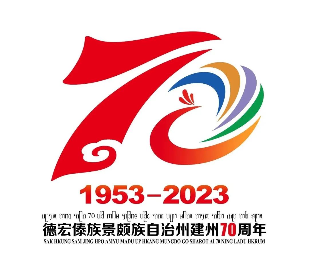 其中孔雀的五色翎羽,象征德宏五種世居少數(shù)民族的團結(jié)互助。旗幟象征引領(lǐng)和砥礪前行。結(jié)合極具民族特色的色彩和歡暢熱烈的表現(xiàn)形式,充分展現(xiàn)了“砥礪奮進70年·德宏逐夢開新篇”的主題理念,以及精彩開放、與時俱進的精神風貌。(設(shè)計者:岑利民)