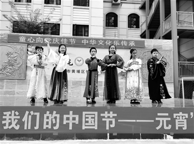 廣州市黃埔區(qū)怡園小學的學生身著漢服慶祝中華傳統(tǒng)節(jié)日元宵節(jié),體驗中華優(yōu)秀傳統(tǒng)文化。(學校供圖)