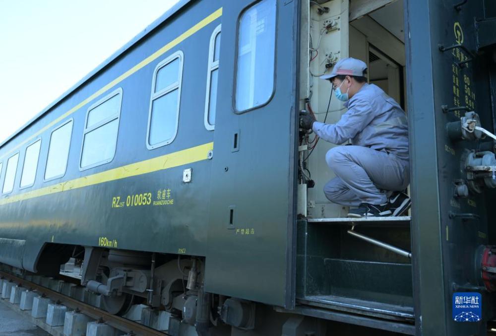 1月4日,在中國鐵路上海局集團有限公司合肥車輛段合肥客車整備場,工作人員對旅客列車車廂車門進行整修。新華社記者 周牧 攝