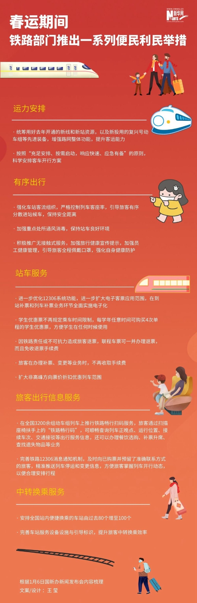 每年春運,鐵路都發(fā)揮著重要作用,今年春運鐵路部門將采取哪些新的舉措?對此,國鐵集團客運部主任黃欣介紹,鐵路部門優(yōu)化春運的客車開行方案,精準落實好疫情防控措施,在乘車、候車、購票等環(huán)節(jié),推出一系列便民利民舉措,全力打造平安、有序、溫馨春運,努力讓旅客體驗更加美好。具體如下: