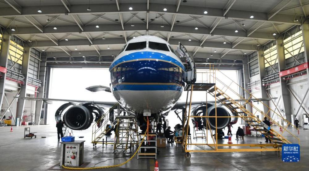 1月5日,在位于海南省海口市的中國南方航空美蘭基地機庫,工程師在對飛機進行檢修。新華社記者 楊冠宇 攝