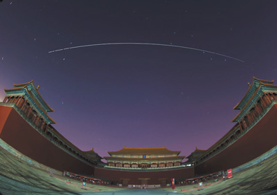 在北京故宮午門拍攝的中國空間站過境照片(軌跡為多張照片堆棧)。新華社記者 邢廣利攝