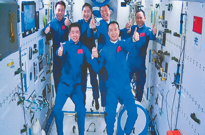 在酒泉衛(wèi)星發(fā)射中心拍攝的神舟十五號航天員乘組與神舟十四號航天員乘組在中國空間站的“太空會師”。新華社記者 郭中正攝