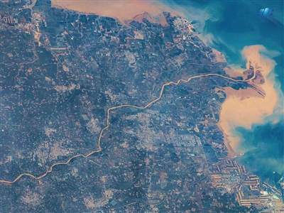 從中國空間站拍攝的黃河入海景觀。航天員 陳 冬攝