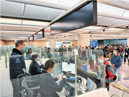 1月8日起,全國(guó)開始實(shí)施取消入境后全員核酸檢測(cè)和集中隔離、取消國(guó)際客運(yùn)航班數(shù)量管控等一系列優(yōu)化中外人員往來管理措施。根據(jù)國(guó)家移民管理局統(tǒng)一部署,昆明邊檢站迅速調(diào)整勤務(wù)安排和疫情防控舉措,全力確??诎俄槙惩P(guān)。