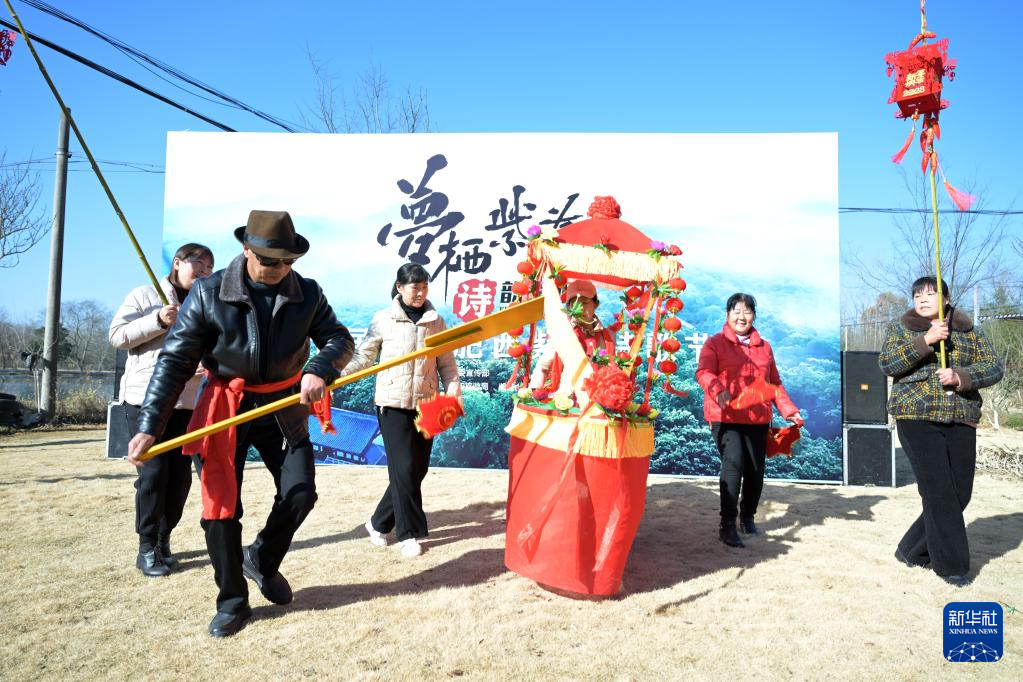 1月8日,民間藝人在第十屆中國·肥西紫蓬詩歌節(jié)線下活動上表演“劃旱船”。新華社記者周牧/攝