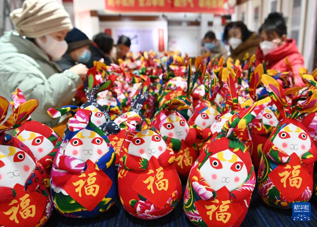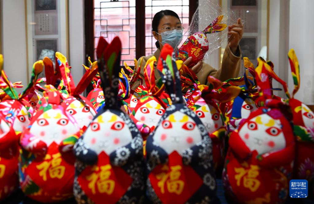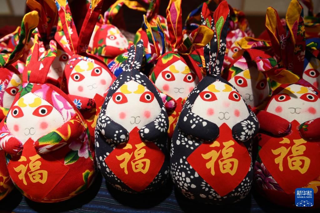 這是1月8日在山東省聊城市東昌府區(qū)棉文化手工博物館拍攝的生肖玩偶兔。新華社發(fā)(張振祥/攝)
