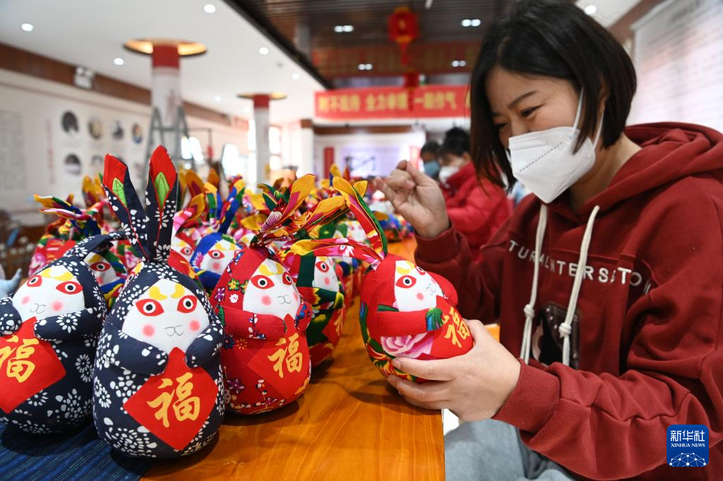1月8日,在山東省聊城市東昌府區(qū)棉文化手工博物館,工人包裝生肖玩偶兔。新華社發(fā)(張振祥/攝)