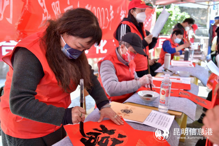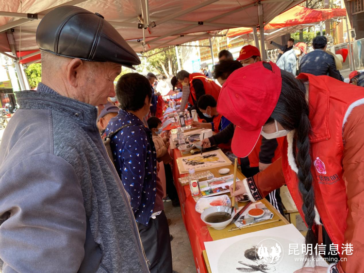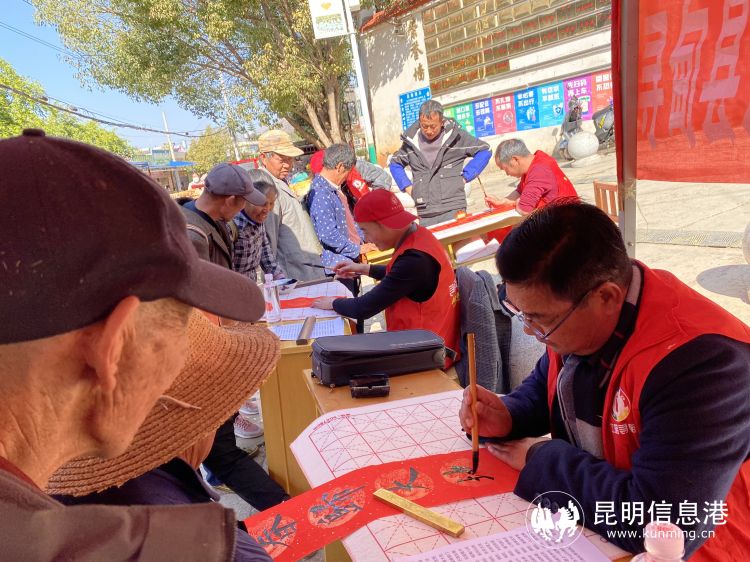 在金源鄉(xiāng)中心完小門前,由昆明書法家協(xié)會(huì)、昆明美術(shù)家協(xié)會(huì)、尋甸書法家協(xié)會(huì)、尋甸美術(shù)家協(xié)會(huì)組成的文藝志愿者團(tuán)隊(duì),在現(xiàn)場(chǎng)潑墨揮毫,將新春的祝福融入到作品中,一張張“?!弊?、一副副對(duì)聯(lián)、一篇篇畫作應(yīng)運(yùn)而生。
