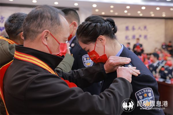昆明信息港訊 記者合宇聰 1月10日上午,昆明市公安局盤龍分局舉行慶祝2023警察節(jié)活動儀式?;顒蝇F(xiàn)場,民警重溫入警誓詞;從警10年、20年、30年民警代表及退休民警代表領受紀念章;退休民警代表為新入警、新晉銜的民警代表佩戴了警銜標志。