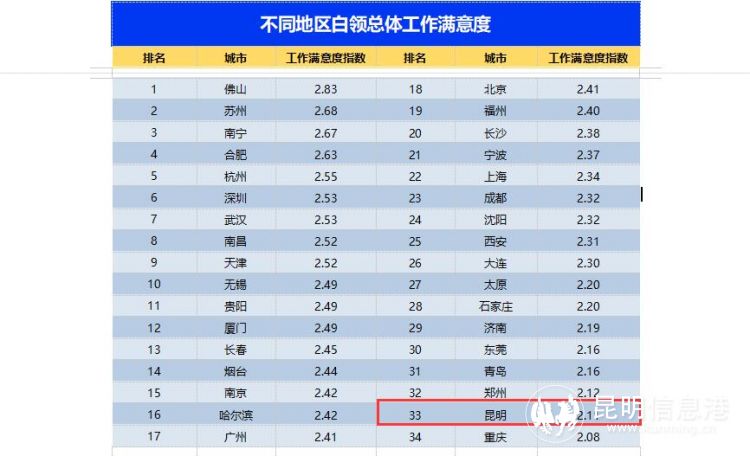 《智聯(lián)招聘2022年白領(lǐng)滿意度指數(shù)調(diào)研報告》近日發(fā)布,其中指出,2022年昆明白領(lǐng)工作滿意度指數(shù)為2.11,低于2.39的全國平均水平,也低于2021年的3.06。在白領(lǐng)工作滿意度指數(shù)全國排名中,位居第33名,僅高于指數(shù)為2.08的重慶。不過,經(jīng)歷三年疫情后,昆明白領(lǐng)的存款狀有所改善。